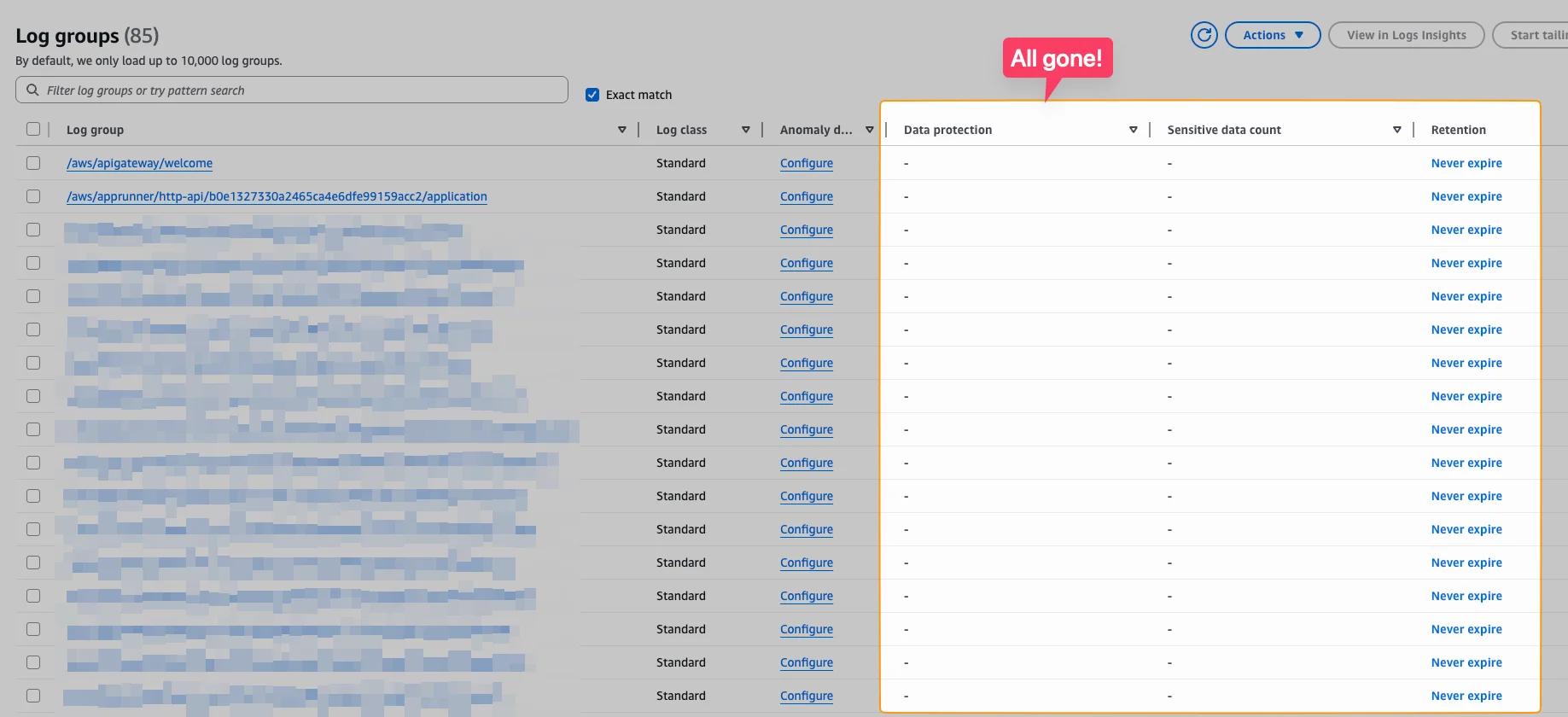 One very important part is that settings of the Log Groups are not applied anymore. For instance the retention setting of how long the logs are stored is gone.
