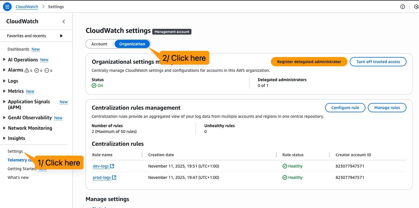 To set up the rules you need to be a delegated administrator. Go to your management account, CloudWatch, Settings, Organization. In there you can assign one delegated administrator for logs.