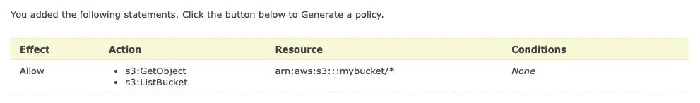 We can choose to add further statements or generate the final policy. When generating, it will appear in a small modal.
