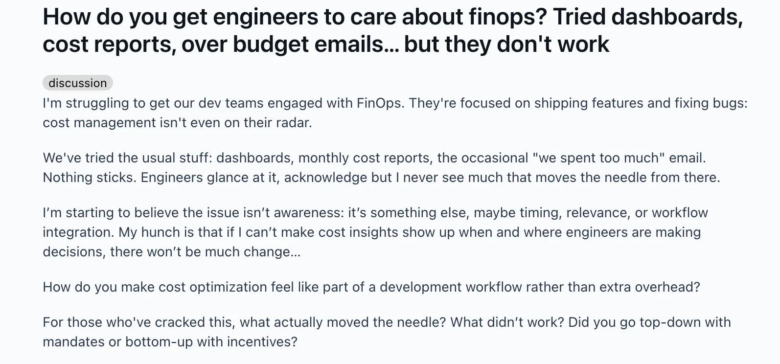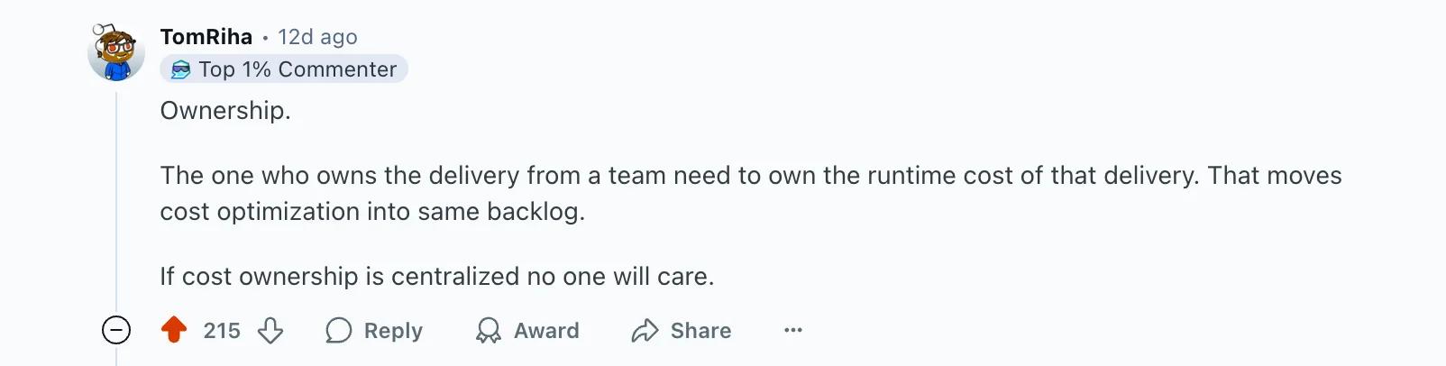 The top answer is spot-on: cost ownership can't be centralized. It needs to be part of every team.